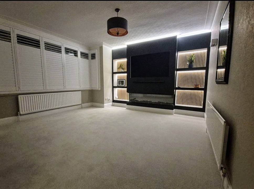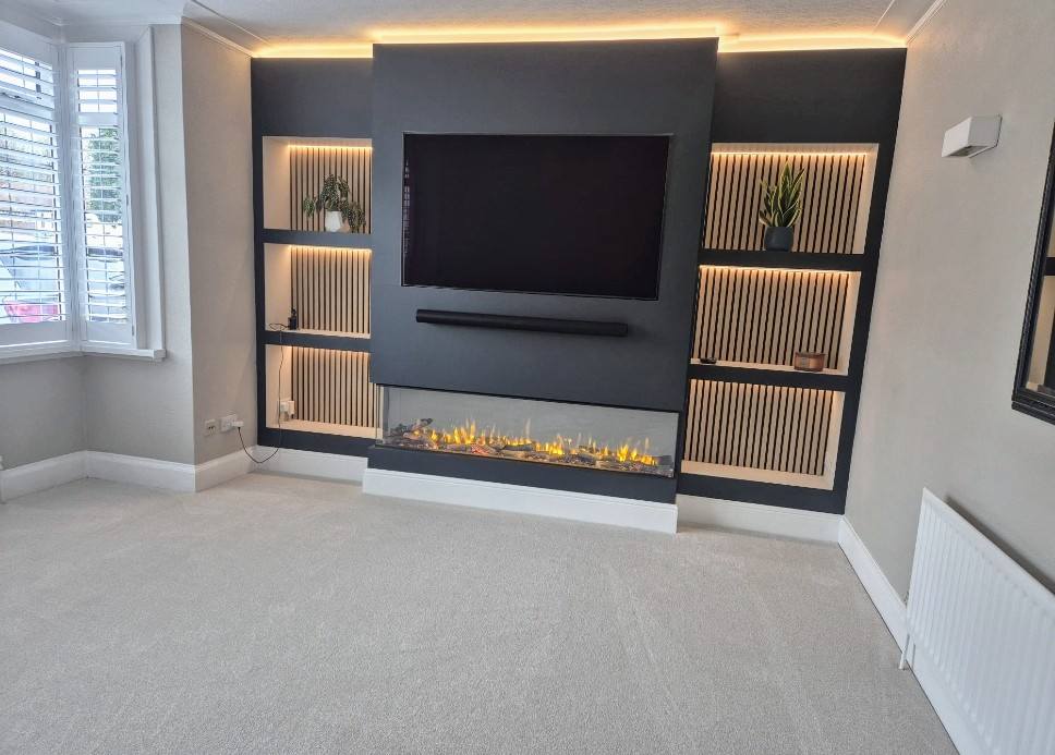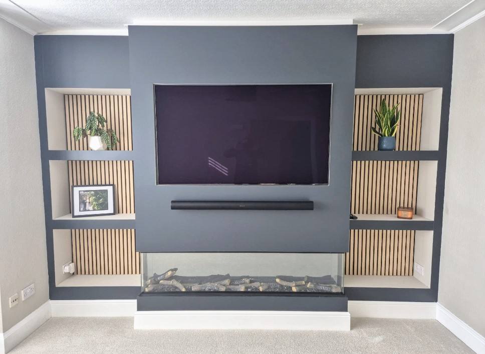 - TV Media Wall with 6 Shelving Areas (With Woodslat Backing & LED Smart Lighting)