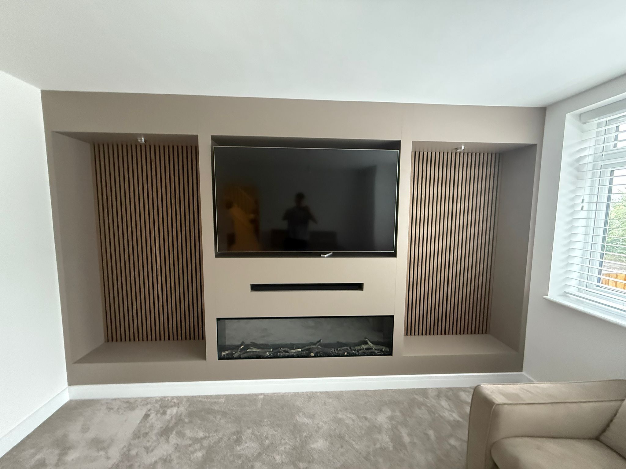 - TV Media Wall with 6 Shelving Areas (With Woodslat Backing & LED Smart Lighting)